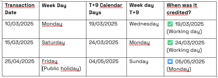 In the case of daily settlement, for example, the funds are credited to the merchant on T+9 calendar days from the transaction execution date (where T is the transaction day).