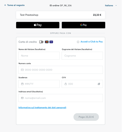 Option to enable the use of Google Pay and Apple Pay. To use it, these payment methods must also be enabled on the merchant profile in GestPay, and the iFrame option must be disabled in the plugin configuration panel on the PrestaShop backend.
